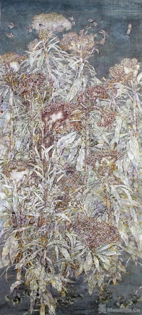创作中,天军教授做了不少突破——造型上,参考了宋人小品画、郎世宁、陈之佛以及近现代名家作品后,决定跳出写实,追求唯美的意象表达;色彩上借鉴西方名画、国内优秀作品和日本岩彩画,跨越时空融合昼夜景象,削弱绿叶的绿色,突出白叶红花,加重背景,让画面更淡雅;视角上,摒弃常见的俯视、平视,采用仰视角度,把鸡冠花画成“树”一样,以蚂蚁的视角呈现,让构图更有张力,画面在方形分割中含椭圆形主体,左右有无限延展的感觉;花型组织上,串联了近10年在泰安、敦煌、家乡等地写生的鸡冠花,涵盖不同生长阶段、形态的植株,像一个“小社会”,体现丰富情态。技法上,传统工笔和水墨已经满足不了天军教授,多次探访敦煌莫高窟、云冈石窟等四大名窟和永乐宫,吸收传统矿物色应用技巧,结合当代岩彩画技法,运用新材料、新媒介和新肌理。《金髻太平》,十年磨一剑,前期画了数以百计的速写草图、大量的电子素材积累,相机用坏两三台,最终在第十二届美展中脱颖而出,一举成功!