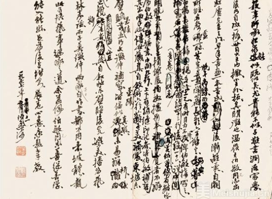 依沙翁上文所论,补笔一事并非罕有其例,若怀素《自叙帖》墨迹“前六行苏子美补写”,又若坡公《赤壁赋》墨迹“前五行文徵仲补写”,且“皆偪似真踪,未易辨析”,不足异也。由此思之,则是卷必可与“《自叙帖》《赤壁赋》后先媲美,播为艺林嘉话”矣。而最可注意者,即“子美、徵仲两家平日自作书,都不用素、坡体”也。至若王伯敏先生,“早年书画一本黄氏,后渐离异,自辟町畦”,前已言之,兹不复赘。殊有可言者,所谓“艺事师承,始求能似。既似矣,尤贵能不似”,此其最著之例也。