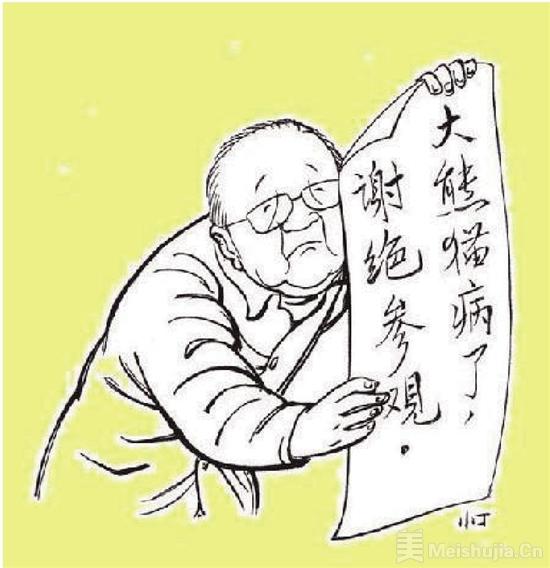 20世纪90年代,著名漫画家丁聪画了一幅漫画《大熊猫病了》。画的是著名书法家启功先生,胖嘟嘟的脸庞上架着一副眼镜,很像国宝大熊猫,双手举着一张纸,上写“大熊猫病了,谢绝参观”字样,署名“小丁”。这是怎么回事呢?